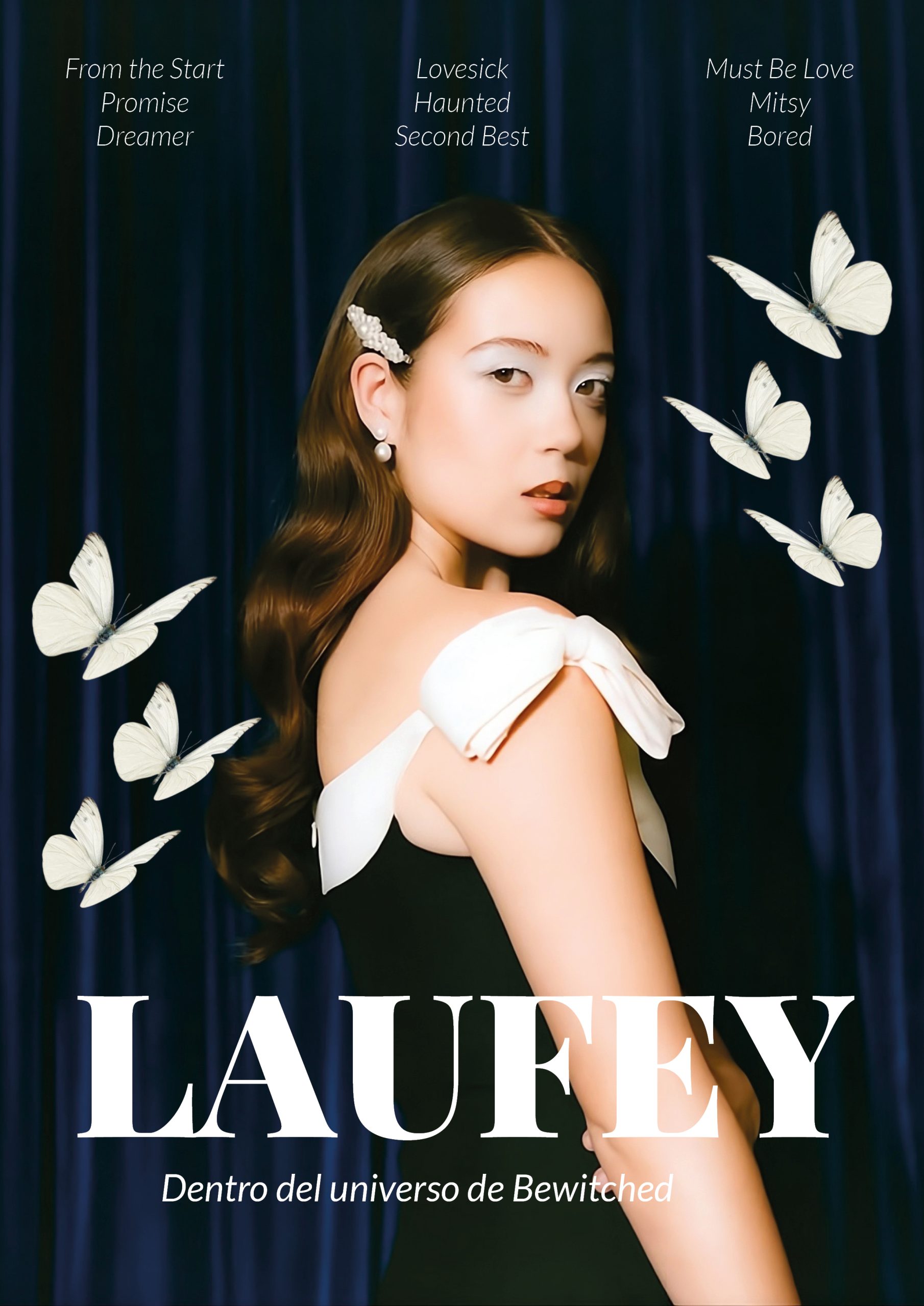 Portada de revista dedicada a la artista Laufey, diseñada bajo un enfoque minimalista que resalta su esencia. Se incorporan elementos visuales y palabras clave que representan su identidad artística, así como referencias a canciones del álbum abordado en la edición.