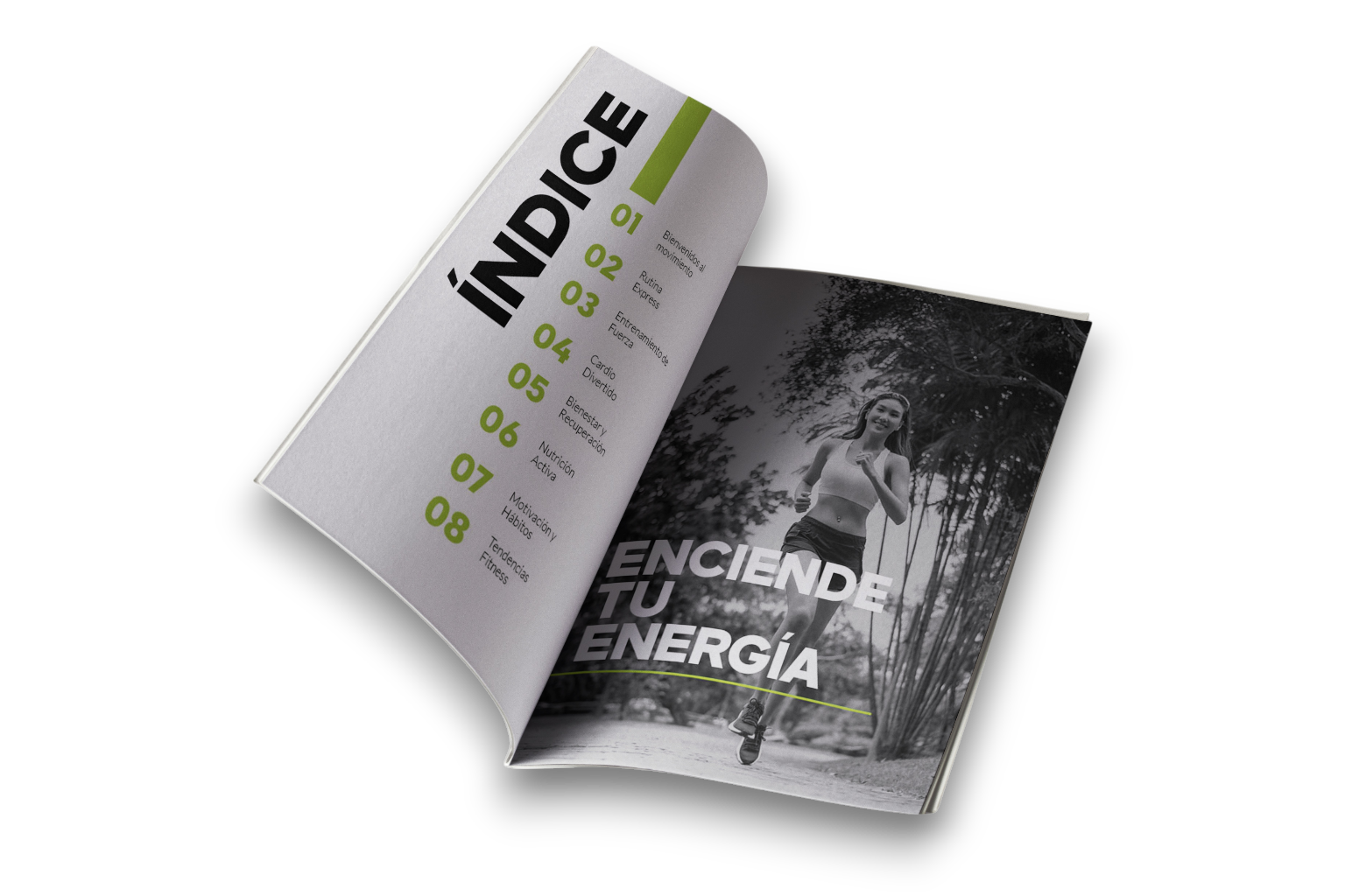 Diseño de un suplemento fitness enfocado en personas que buscan mejorar su salud a través de hábitos equilibrados. Este contenido promueve una alimentación saludable, ejercicios rápidos y efectivos, así como rutinas exprés adaptadas a un estilo de vida dinámico.