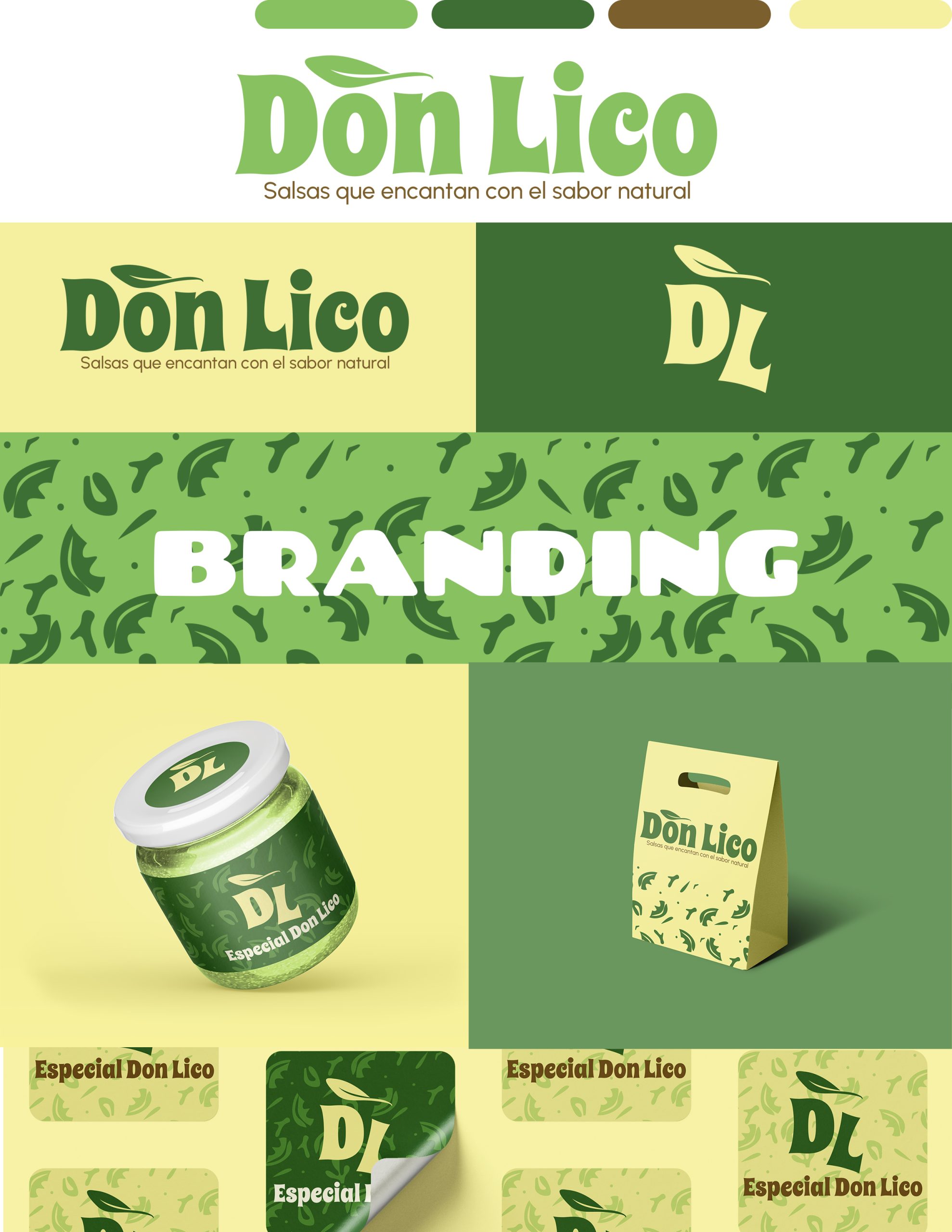 Para esta marca se desarrolló una línea gráfica que representa lo natural y lo artesanal, valores que caracterizan la esencia de Don Lico, una marca enfocada en la elaboración de salsas artesanales.