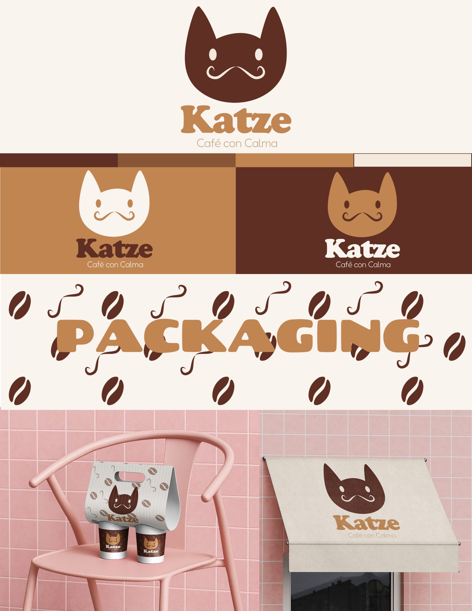 Para la marca Katze se desarrolló una identidad visual pensada para transmitir cercanía y creatividad, reflejando la esencia de una cafetería y la experiencia de disfrutar el café en un ambiente acogedor. El isotipo está inspirado en la figura de un gato, elemento que aporta personalidad y conexión con el concepto de la marca.