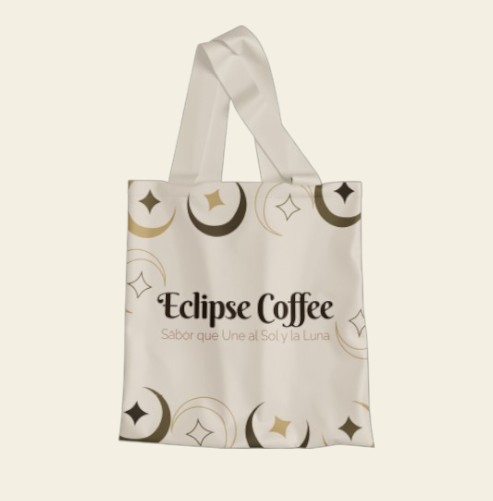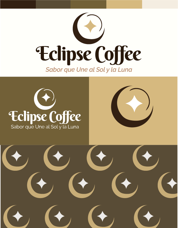 El isotipo se creó a partir de los elementos esenciales que representan un eclipse, utilizando formas simples que permiten generar una imagen visual clara y memorable. La paleta de colores se compone de tonos café, relacionados con el café, y un tono amarillo que aporta contraste y energía a la identidad visual.